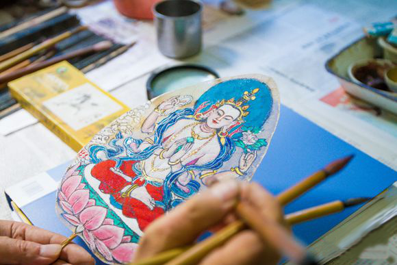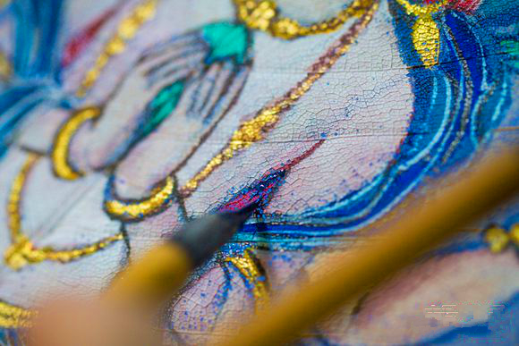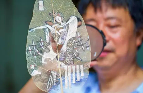 The production of leaf vein paintings is a complex process. Each piece requires picking bodhi leaves or other broad leaves, which are carefully processed through traditional techniques such as corrosion (where biological yeast dissolves the leaf flesh), drying, and washing to produce the leaf veins. Then, traditional painting methods are used to hand-draw outlines, apply colors, and add gold detailing. The entire procedure involves more than 30 meticulous steps, mostly done manually, reflecting the craftsmen’s dedication to preserving this intricate art form.