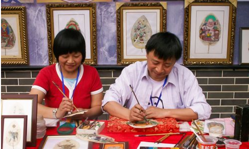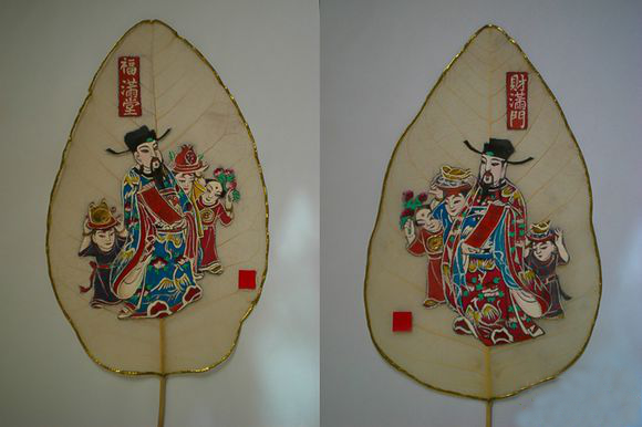 Black-and-white leaf vein painting is the oldest and most traditional technique. Without any color embellishment, its quality depends entirely on the lines. For a more splendid effect, gold leaf is applied. For example, on the painting "Five Sons Bringing Happiness," the gold leafing part took two months to complete.